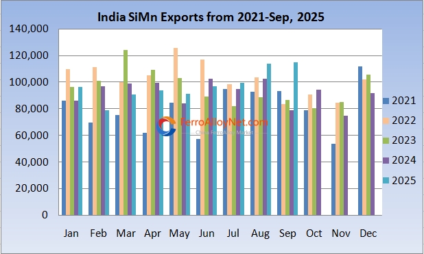 Theo số liệu mới công bố từ Bộ Công Thương Ấn Độ, lượng nhập khẩu silico manganese (SiMn) trong tháng 11/2025 đạt 115.067 tấn, gần như giữ nguyên so với tháng 8. Tuy nhiên, mức tăng trưởng theo năm lại rất ấn tượng, tăng 45,8% YoY so với con số 78.922 tấn của tháng 9/2024.