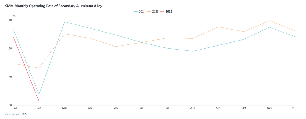 Về nguồn cung, tỷ lệ hoạt động của ngành công nghiệp hợp kim nhôm thứ cấp đạt 31,3% trong tháng 2, giảm mạnh 22,6 điểm phần trăm so với tháng trước và giảm 11,7 điểm phần trăm so với cùng kỳ năm ngoái. Do ảnh hưởng của việc tạm ngừng sản xuất tập trung trong dịp Tết Nguyên đán, các doanh nghiệp đã chứng kiến sự sụt giảm đáng kể số ngày sản xuất hiệu quả, với sản lượng giảm từ 30% đến 50% đối với hầu hết các doanh nghiệp, dẫn đến sự thu hẹp đáng kể về phía nguồn cung của ngành. Ngoài ra, các biện pháp kiểm soát liên quan đến bảo vệ môi trường được thắt chặt ở một số khu vực trước kỳ nghỉ lễ, và với các quy định chi tiết về chính sách tài chính và thuế như "hóa đơn ngược" vẫn chưa được làm rõ, các doanh nghiệp trở nên thận trọng hơn trong sản xuất; một số doanh nghiệp đã nghỉ lễ sớm hoặc trì hoãn việc nối lại hoạt động, và một số thậm chí đã gần như ngừng hoạt động cả tháng.